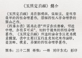 《玉照定真经》是现存的我国古代最早的四柱命理著作,堪称四柱八字命理学的开山之作,被明代的《永乐大典》和清代的《四库全书》列入术数类命书、相书之属,有极高的学术价值和历史地位。