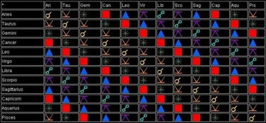 我们从左到右从左边第一行第一个星座开始对比星座的关系。七个星座位置:黄色(表合相):聚集、停滞这种组合不需要过多解释。彼此行星落于同一星座(月亮星座)沟通或是理解都较为容易,鲜会给彼此造成情绪上的痛苦。