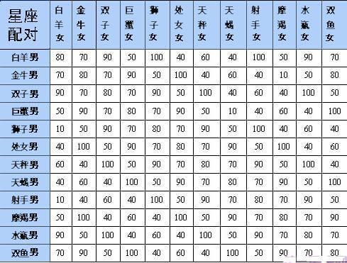 星座姻缘配对指数表(星座配对查询)